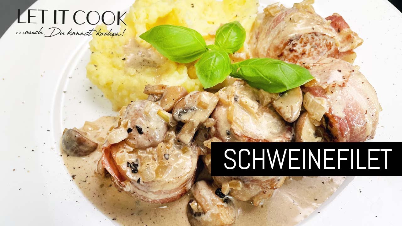 Schweinefilet im Speckmantel mit Rahmsauce mit Pfeffer Pilz Rahm und Kartoffelpüree
