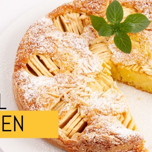 Apfelkuchen aus der Form nehmen, mit Puderzucker bestreuen und sofort servieren
