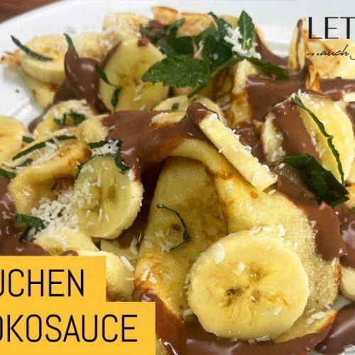 Die Pommes Kuchen mit Banane, Schokoladensoße, Kocos raspeln und Minze anrichten und sofort genießen