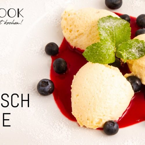 Himbeerpüree auf den Teller geben, Nocken aus der Bayrisch Creme ausstechen und auf das Himbeermark legen