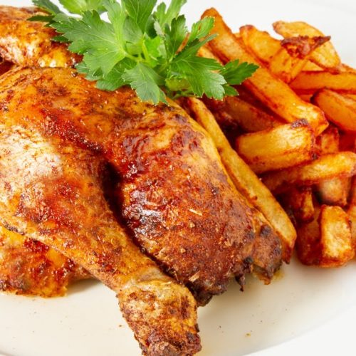 Huhn mit Pommes und Petersilie anrichten und sofort servieren