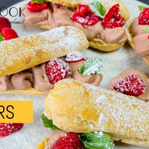 Eclairs halbieren, Schokoladen Sahne auf die Böden auftragen