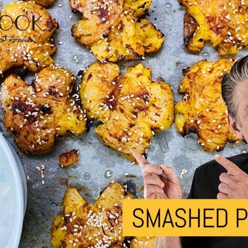 Kartoffeln mit Topf zerquetschen, marinieren und auf Backblech ausbreiten