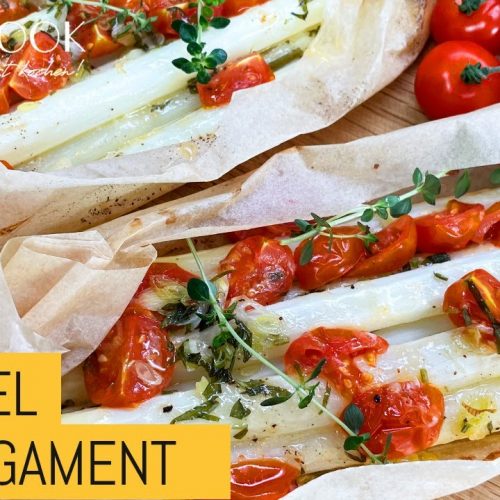 Spargel auf Backpapier geben, mit Parmesan, Tomaten, Frühlingszwiebeln, Estragon, Pfeffer und der reduzierten Marinade würzen