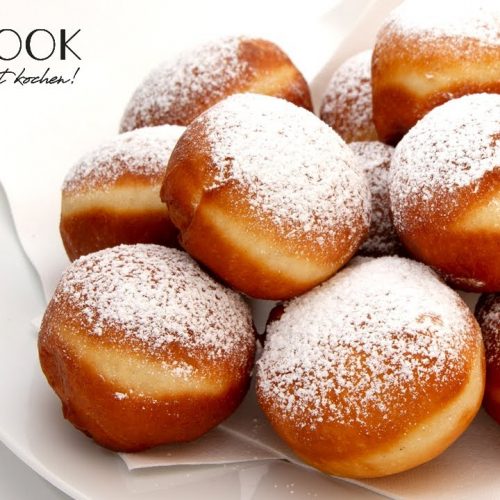 fertige Krapfen mit Puderzucker bestäuben und lauwarm genießen