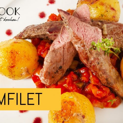 Lammfilet quer halbieren und mit Ratatouille, Kartoffeln und Rotweinsauce anrichten und sofort servieren