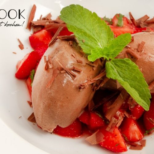 mit einem warmen Löffel Nocken aus der Mousse stechen und mit dem Erdbeersalat und Schokoladensplittern anrichten