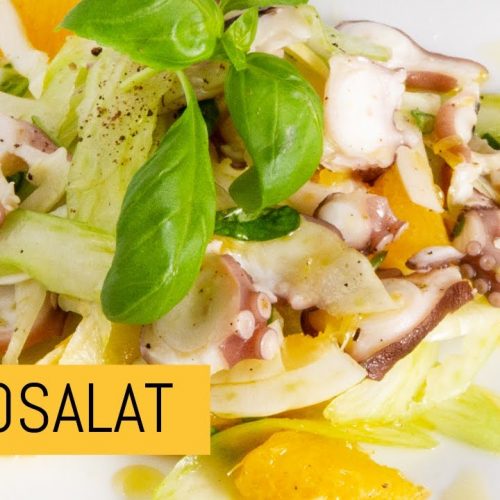 Basilikum schneiden und mit dem Pulpo zusammen zum Salat geben