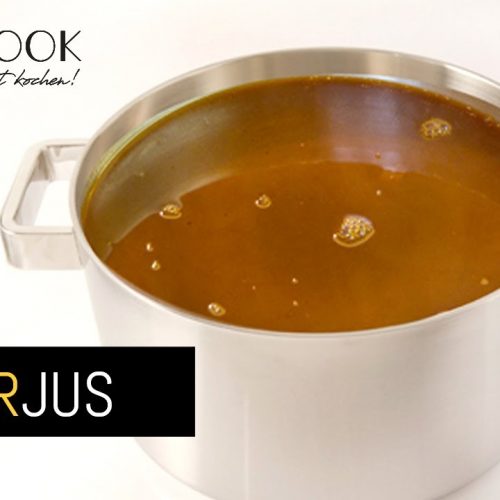 Sauce noch einmal auf 1/3 reduzieren, entfetten, leicht mit Stärke binden und abfüllen