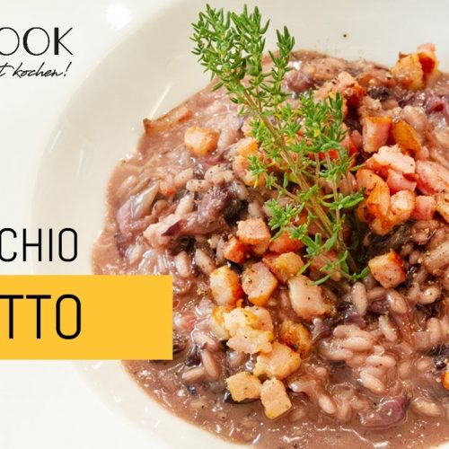 Radicchio halbieren, Strunk entfernen und klein schneiden