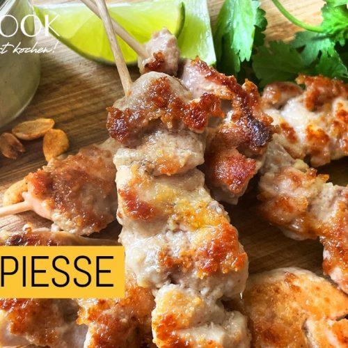 Fleischstücke wellenförmig auf die Holzspiesse stecken