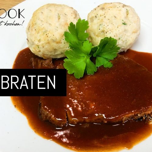 Braten aufschneiden und mit Sauce und knödeln servieren