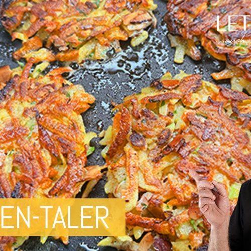 Taler formen und mit Öl und Butter in der Pfanne anbraten bis sie eine schöne goldbraune Farbe bekommen