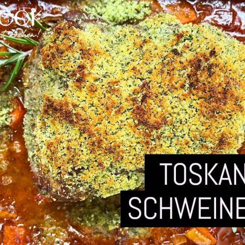Mit Weißwein ab löschen und einkochen. Den Saucenansatz in eine Auflaufform geben und den Schweinebraten darauf platzieren