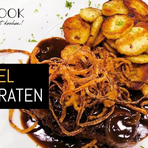 Das Steak mit den Röstkartoffeln, der Zwiebelsauce und den Röstzwiebeln anrichten und sofort servieren